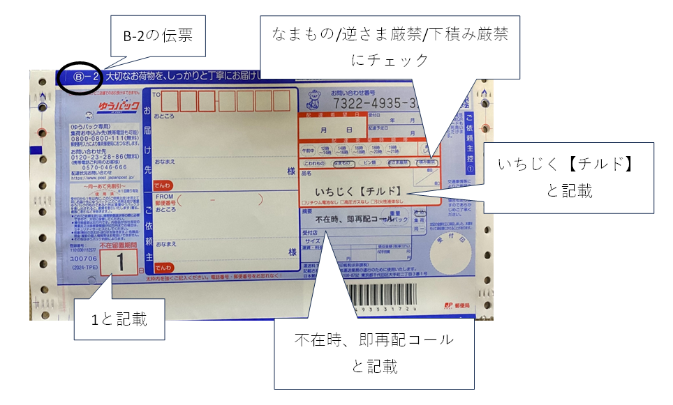 ・発送伝票は直売所にてご用意しておりますが、記入スペースが狭い為記入済み伝票を持ってきて頂けますと幸いです。