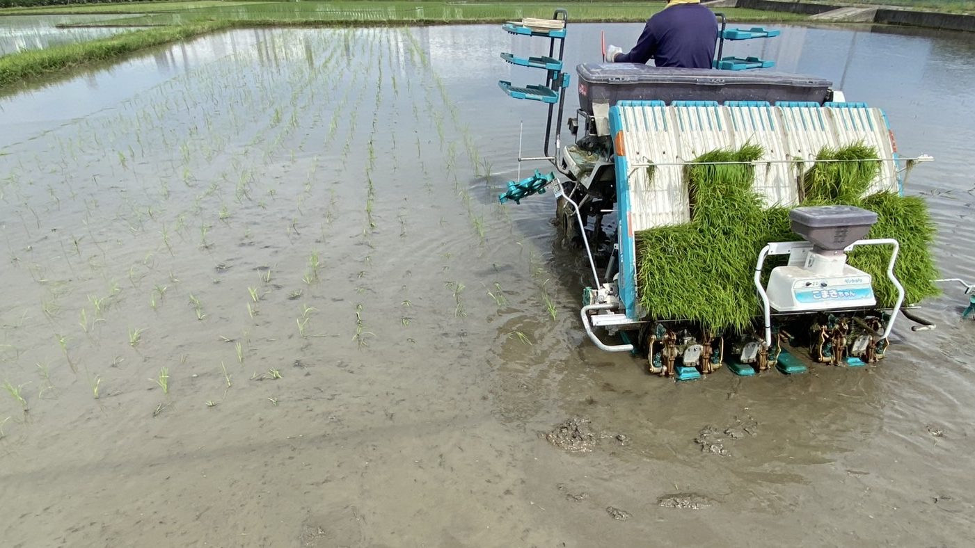 稲が育つように水の管理とともに、植える間隔にもこだわりながら植え付けます。